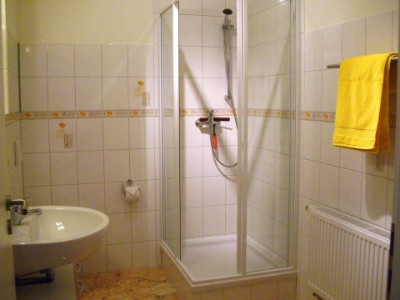 Ausstattung Bad: Dusche, Waschbecken, WC, Ablage, Spiegel, Schrank, Radio